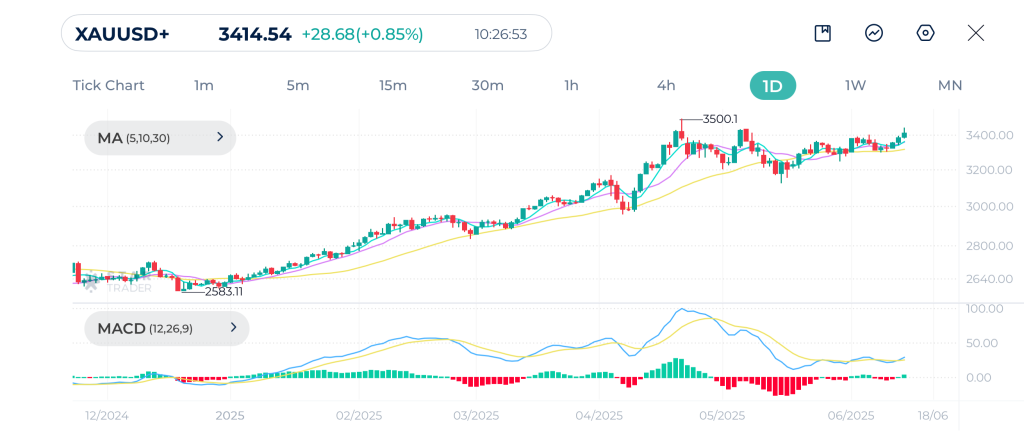 دفعت الاضطرابات الجيوسياسية في الشرق الأوسط أسعار الذهب إلى الارتفاع. ففي أعقاب الغارات الجوية الإسرائيلية على إيران، ارتفع الذهب إلى أعلى مستوى له منذ أوائل مايو عند 3,423 دولارًا للأونصة، مدفوعًا بالطلب على الملاذ الآمن. وعززت أرقام التضخم الأمريكية الضعيفة وبيانات الوظائف المتراجعة أسعار المعدن الثمين.