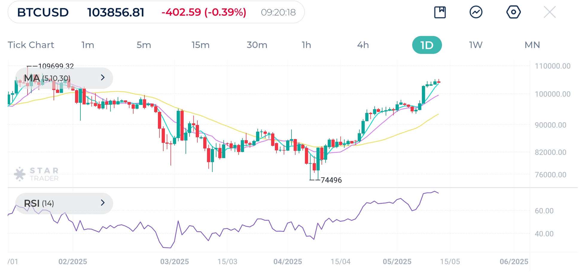 Bitcoin still shows a strong bullish trend on the daily chart. Price is moving above moving averages (5, 10, 30) with clear bullish crossover
