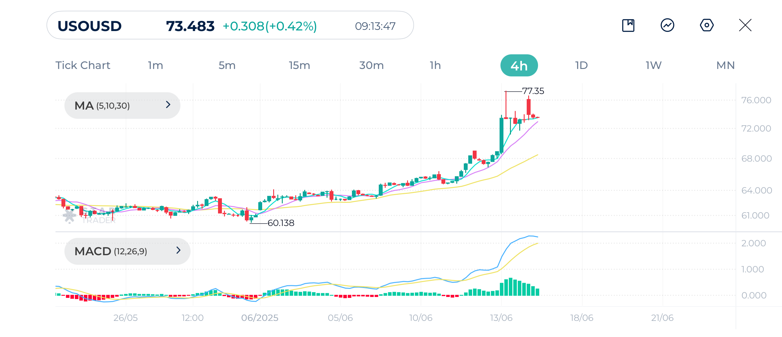 Oil has shown a strong bullish trend since the beginning of June. The 4H chart shows a short-term pullback currently in progress following last week’s gains.