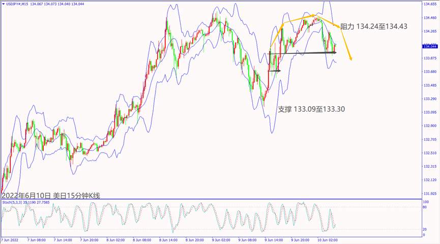 日级别线图,十字星反转,KD死叉信号,可能转跌;15分钟K线,出现圆形顶反转,134.00关口若掼破,大有可能回测前低支撑。