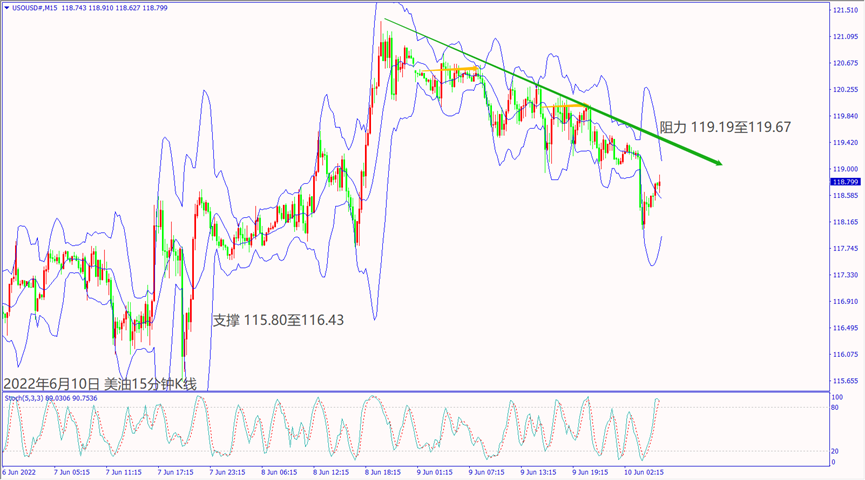 昨天(9日)受到欧美股指下跌影响,造成美油价格一度回落至119.00关口,但是美国能源安全官员建议限制印度进口俄罗斯石油数量,利好美油价格止跌。预期今天美国公布经济数据利淡股指下跌,美油价格若掼破5日均线118.95美元,建议可短空操作。