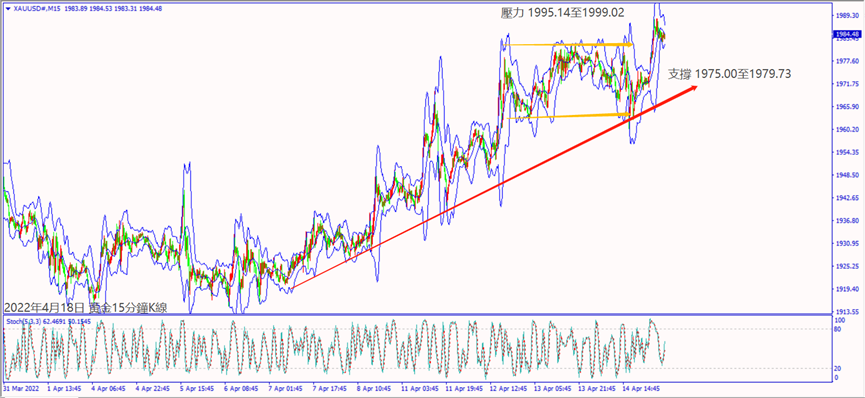 日級別線圖,長下影線黑K回測5日均線,1980關口若突破,有望延續漲勢;15分鐘K線,短線形成盤漲,守住前波盤整頂部,大有可能挑戰上方壓力。