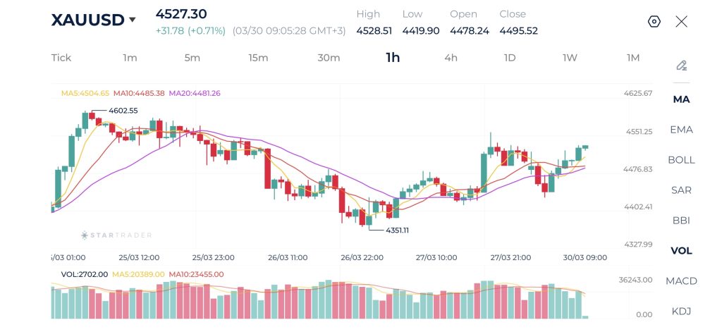 Giá vàng hiện đang giao dịch trở lại trên mức $4,520 và cho thấy dấu hiệu phục hồi tăng trong ngắn hạn sau khi tạo đáy quanh vùng $4,350 vào tuần trước. Diễn biến giá cho thấy sự chuyển đổi từ giai đoạn giảm sang một xu hướng tăng điều chỉnh, với các đáy cao dần hình thành và các đường trung bình động bắt đầu hướng lên.